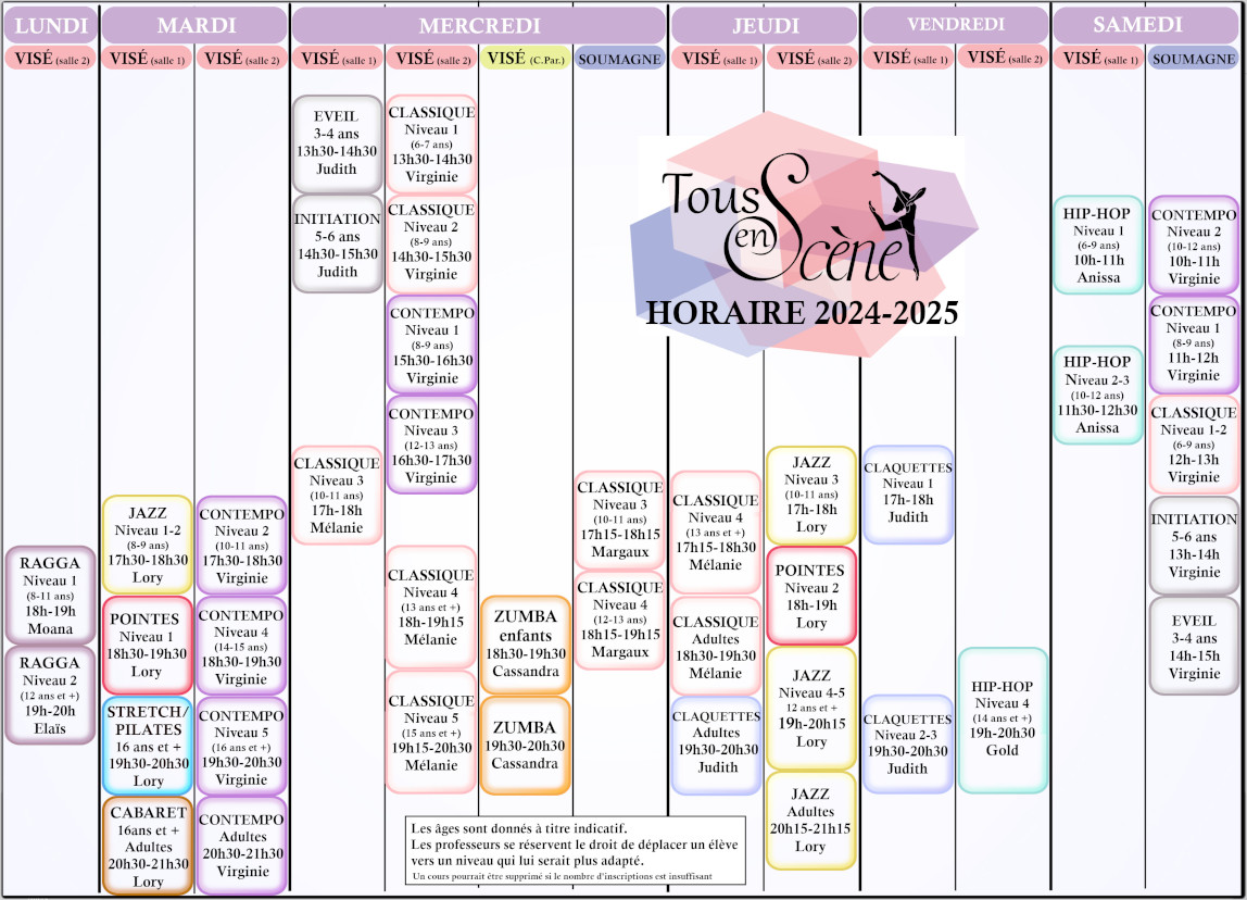 Du 9 au 22 juin, nos cours sont ouverts. Vous voulez essayer un cours de classique, ragga, hip-hop... ou un autre de nos cours ? Présentez-vous simplement avec vos chaussons (ou en chaussette) au début du cours correspondant à votre âge (voir horaire ci-dessous) et profitez du cours.